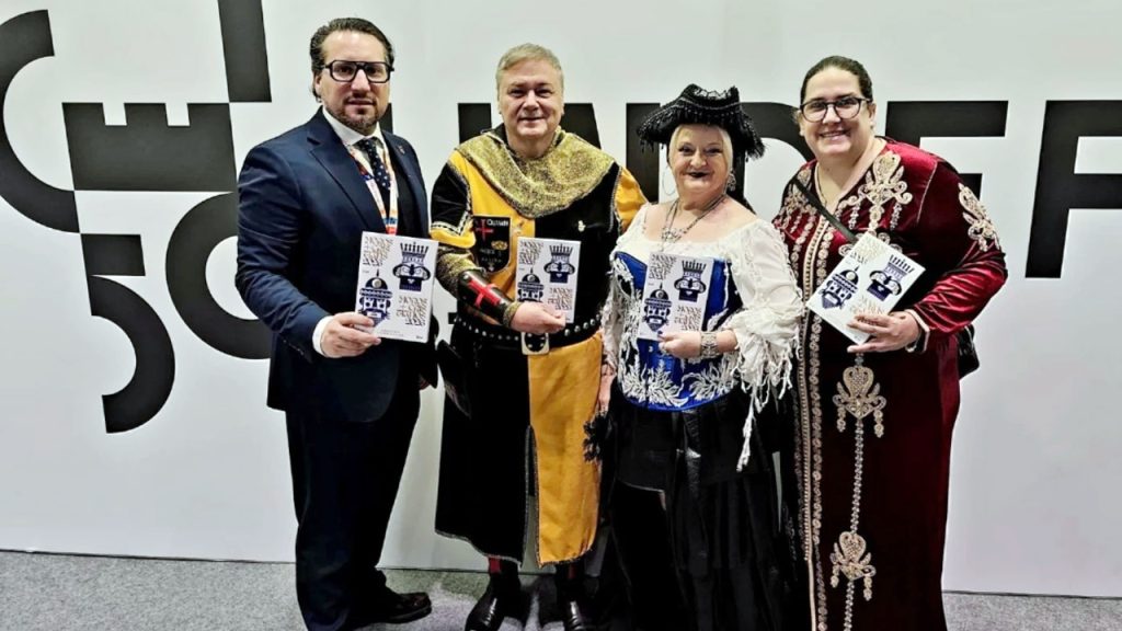 El president Juan Santacreu, la capitana Mariluz Trinidad i els directius José Gabriel Piera i Creu Casañ ens representaren junt a la delegació de l’Ajuntament d’Alzira promocionant el nostre poble I la nostra Festa.